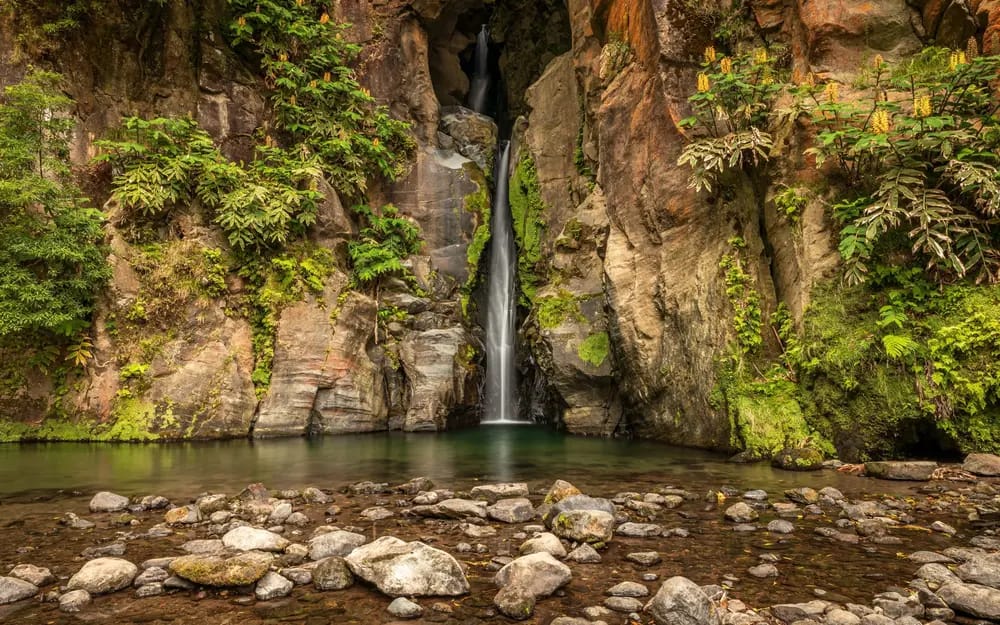 Located on the slopes of Lagoa do Fogo, the Caldeira Velha hot springs are the perfect refuge for anyone looking to relax. The warm, iron-rich waters flow between rocks and tropical vegetation, creating an almost prehistoric environment. The thermal waterfall is the highlight: an outdoor bath surrounded by nature, with naturally perfect temperatures. This is one of the most popular hot springs in the Azores and ideal for visitors searching for relaxing volcanic experiences.
